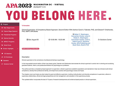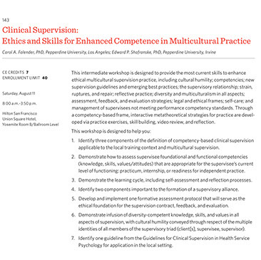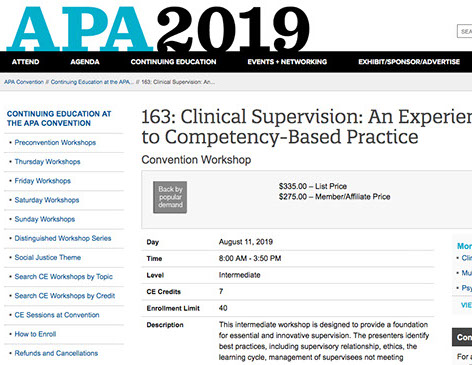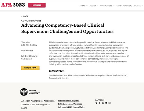 Falender, C. A., & Shafranske, E. P. Clinical Supervision: An Experiential Approach to Competency-based Practice. APA Continuing Education Workshop. American Psychological Association Convention, Chicago, Illinois, August 11, 2019, 8am to 3:50pm.