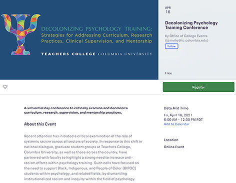 • Decolonizing Psychology Training Conference - A virtual full day conference to critically examine and decolonize curriculum, research, supervision, and mentorship practices. (April 2021)