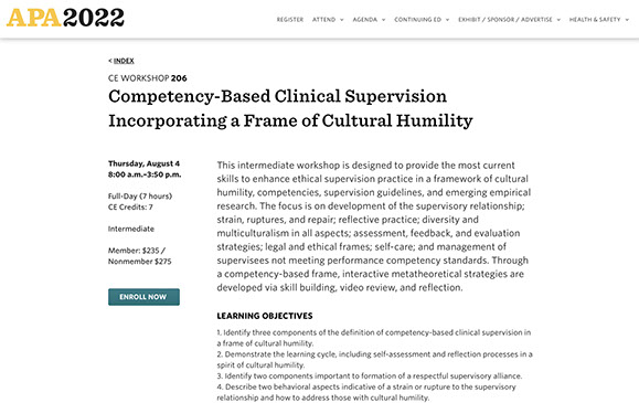 Multicultural Clinical Supervision—Psych Seminar: This workshop introduces the most current best practices, research, and guidelines for multicultural clinical supervision and telesupervision within the frame of cultural humility (May 2023)
